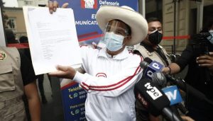 El candidato presidencial del partido Perú Libre, Pedro Castillo, acudió hoy a la Defensoría del Pueblo para presentar un documento donde pide se garantice sus
