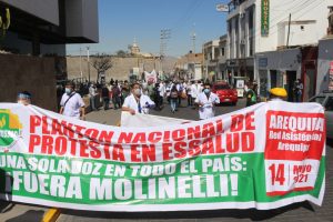 Médicos de Essalud protestaron al frontis del Hospital Carlos Alberto Seguín Escobedo. El personal pide la destitución de la presidente ejecutiva de Essalud, Fiorella Molinelli.