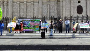 Un grupo de ciudadanos de los colectivos unidos de la subcuenca del Cotahuasi, pesacadores camaroneros y cuenca del río Ocoña, protestaron en el frontis de