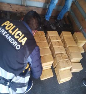 Detención. Personal policial de Área Antidrogas (Areandro) detuvieron en la ciudad de Juliaca, a tres personas que transportaban en un camión 99 paquetes rectangulares con