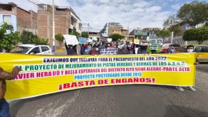 Protesta. Con carteles en manos y silbatos, un grupo de pobladores de las asociaciones de vivienda Javier Heraud y Bella Esperanza ubicados en la parte