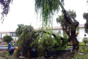 Una fuerte lluvia y un ventarrón ocasionaron la caída de parte del árbol emblemático sauce llorón que está ubicado en la plaza Regocijo, ubicado frente
