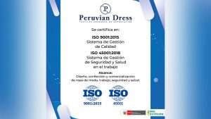 PERUVIAN DRESS S.A.C obtiene Certificación Internacional en ISO 9001:2015 Sistemas de Gestión de la Calidad e ISO 45001:2018 Sistema de Gestión de Seguridad y Salud en el Trabajo.