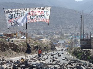 La entrada a la ciudad de Arequipa en la vía de Yura, kilómetro 17, se encuentra bloqueada con piedras. La circulación de vehículos está restringida.