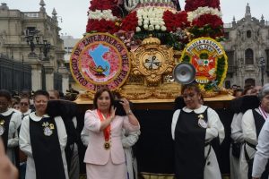 La presidenta de la República, Dina Boluarte, participó en la procesión anual de Santa Rosa de Lima. La jefa de Estado compartió la carga del