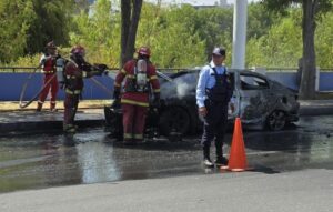 Un automóvil Hyundai Accent con placa ABR-923 qedó completamente calcinado tras incendiarse en el carril de bajada de la avenida La Marina, en Arequipa. El
