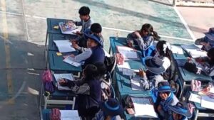 Alumnos obligados a recibir clases en pleno patio de la institución, soportando altas temperaturas y en condiciones inadecuadas