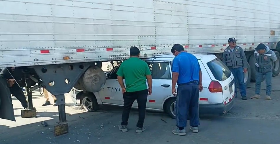 Un aparatoso accidente de tránsito se registró este martes en la avenida Jorge Basadre, en la ciudad de Tacna. Un vehículo station wagon de placa Z2L-081 terminó incrustado bajo un tráiler de matrícula A0H-899.