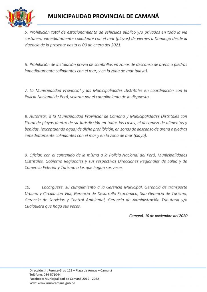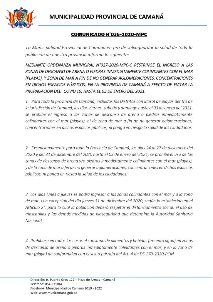 El pasado 10 de noviembre la municipalidad provincial de Camaná emitió el comunicado 036- 2020 en el que da cuenta de las prohibiciones del uso de las playas durante la temporada de la pandemia.