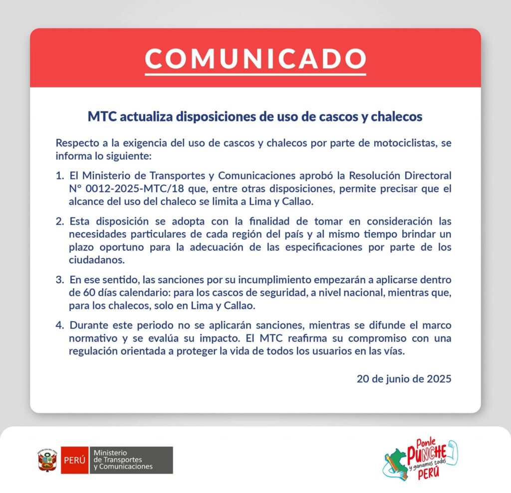 Consciente de la incomodidad que generan en las familias y trabajadores, Arriola llamó a la población a cumplir con la Resolución Directorial 008-2025-MTC la cual actualmente se cumple en Lima y Callao.