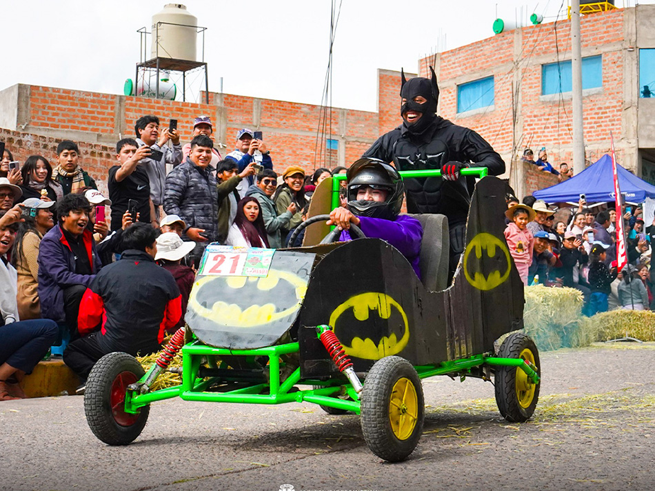Las familias juliaqueñas disfrutaron de un desfile de vehículos artesanales llenos de ingenio y color, con diseños inspirados en personajes, animales y figuras emblemáticas. En una competencia marcada por la originalidad, el Batimóvil —inspirado en el legendario héroe Batman— se consagró como el carro más veloz y se llevó el primer lugar.