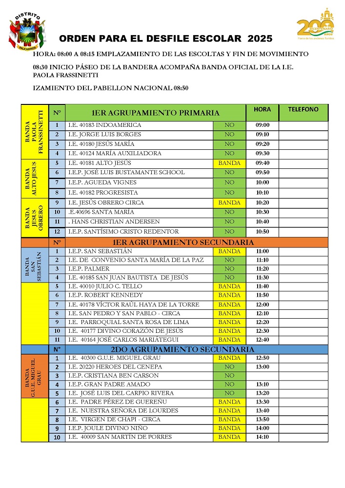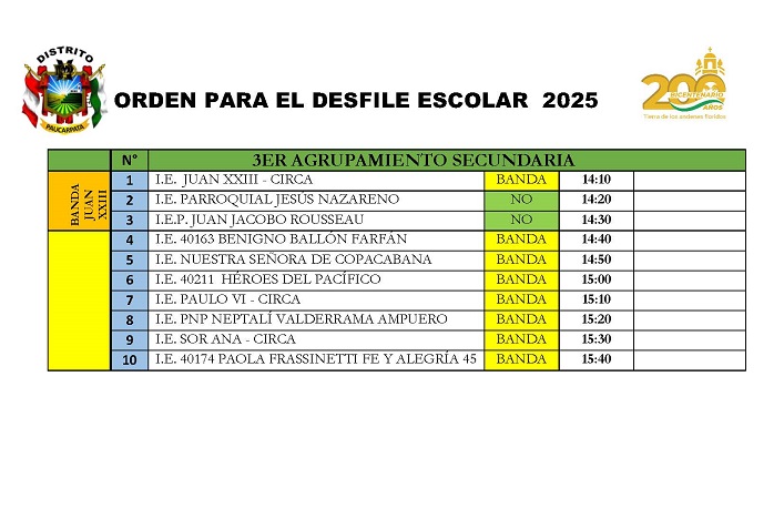 La Municipalidad Distrital de Paucarpata confirmó el orden oficial y hora exacta de presentación de las 43 instituciones educativas que participarán en el Desfile Escolar por Fiestas Patrias 2025.