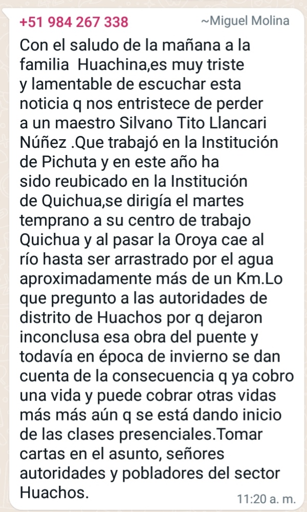 Según la investigación policial, el pasado lunes 08 de marzo, el profesor Tito Llancari salió de su domicilio con destino a la escuelita de Quichua, pero debido a que la obra del puente en el distrito de Huachos está inconclusa, tuvo que subir a la «oroya», que es una especie de andarivel para cruzar al otro extremo, pero desafortunadamente cayó al caudaloso río Arma, el cual lo arrastró más de un kilómetro.