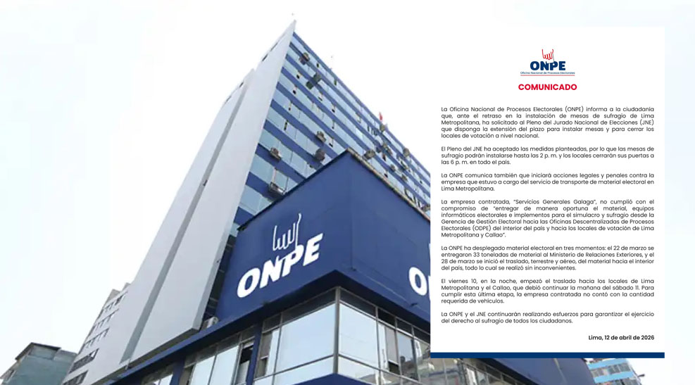 La Oficina Nacional de Procesos Electorales anunció que iniciará acciones legales y penales contra la empresa Servicios Generales Galaga por el retraso en la entrega de material electoral durante las Elecciones Generales 2026. La medida responde a las fallas registradas en la distribución de insumos en Lima Metropolitana, especialmente en la zona sur de la capital.