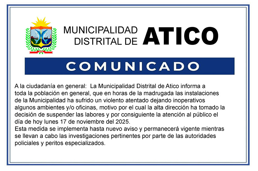 La Fiscalía Provincial Penal Corporativa de Caravelí inició una investigación preliminar por el presunto delito de extorsión, luego de que una fuerte explosión ocurriera en la fachada de la Municipalidad Distrital de Atico, provincia de Caravelí (Arequipa), durante la madrugada del 17 de noviembre.