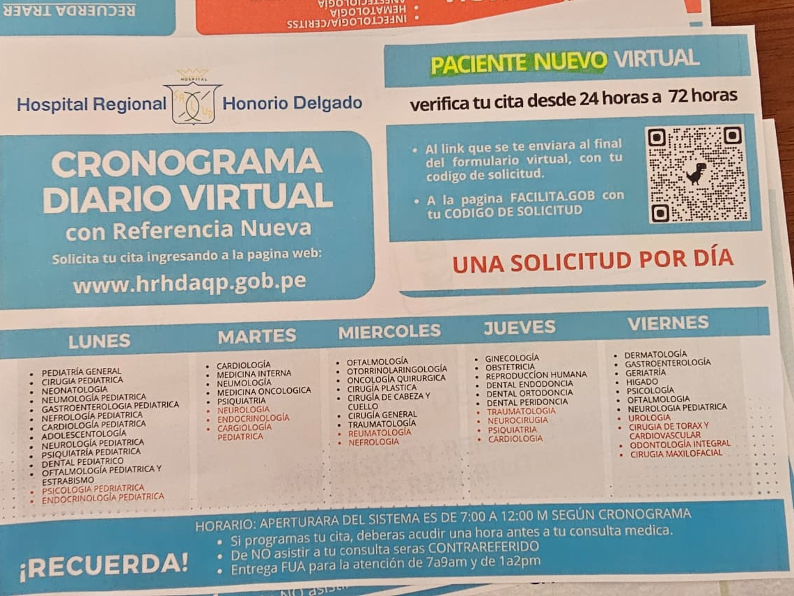 Debido a las largas colas registradas en las últimas semanas en el Hospital Honorio Delgado, la institución implementó el sistema virtual “Cero colas” para la asignación de citas médicas. La alta demanda obligaba a los pacientes a esperar desde la madrugada para acceder a una atención. Con esta medida, se busca reducir la afluencia presencial y agilizar el proceso.