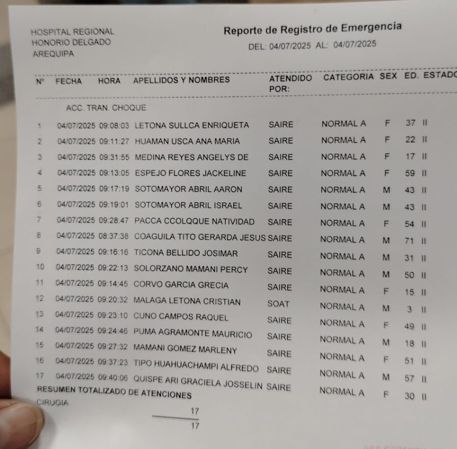 Un total de 17 heridos fueron trasladados al Hospital Regional Honorio Delgado y otros 10 a la clínica San Juan de Dios.