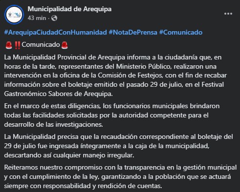 En respuesta, la Municipalidad Provincial de Arequipa emitió un comunicado en el que asegura que brindó todas las facilidades a la Policía y a la Fiscalía para que recaben la documentación necesaria y esclarezcan los hechos.