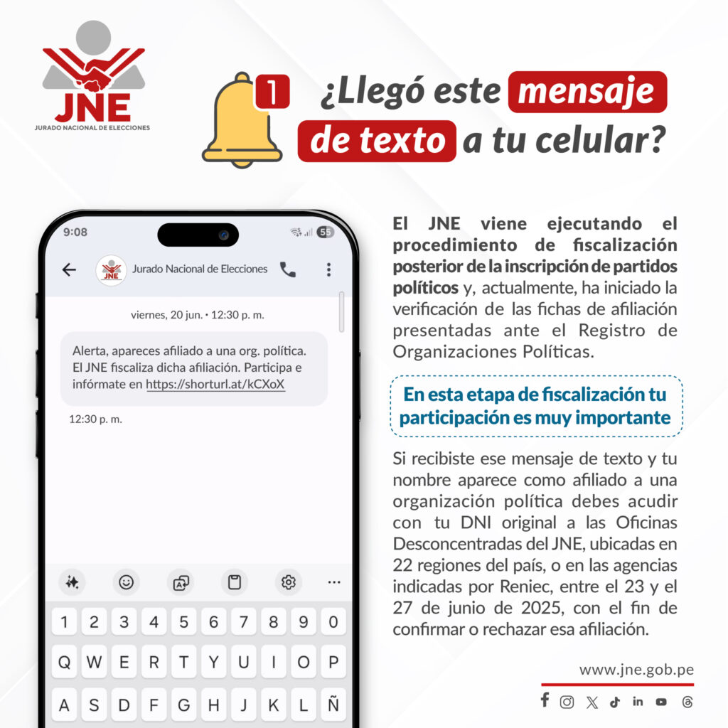El objetivo es que los ciudadanos verifiquen si su afiliación es auténtica. El mensaje que recibirán será: “Alerta, apareces afiliado a una organización política. El JNE fiscaliza dicha afiliación. Participa e infórmate aquí”.