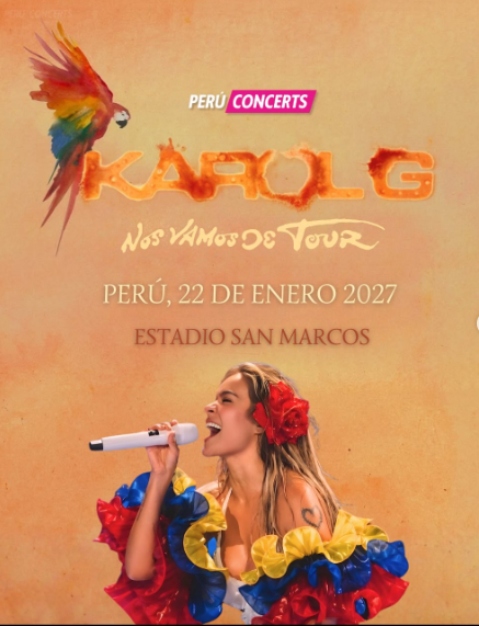 La cantante colombiana Karol G confirmó su regreso a Perú con un concierto en Lima el próximo 22 de enero de 2027, como parte de su gira internacional “Viajando por el mundo Tropitour”. El espectáculo se realizará en el Estadio San Marcos, donde interpretará sus mayores éxitos y nuevos temas, en uno de los shows más esperados por sus seguidores.