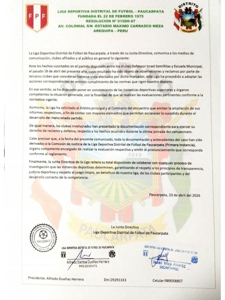 La Liga Deportiva Distrital de Fútbol de Paucarpata emitió un comunicado oficial este 23 de abril de 2026, en el que informa sobre las acciones adoptadas tras los hechos ocurridos en el partido disputado entre Defensor Israel Semillitas y Escuela Municipal (28-0), correspondiente a la última jornada de la Liga de Paucarpata.