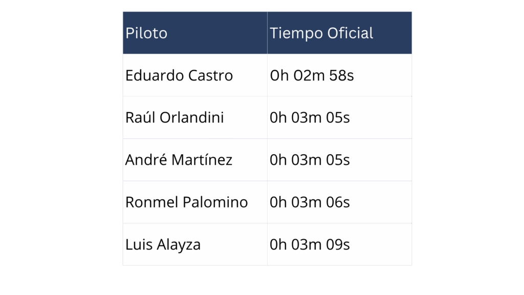 Luego de una jornada de intensa adrenalina en Chilca, estos fueron los cinco mejores pilotos que derrocharon técnica, velocidad y resistencia en un circuito con tramos de tierra y curvas largas. Un verdadero reto que generó problemas a más de un competidor. Durante la pasada de las máquinas de exhibición, el joven piloto Derek Baigorria sufrió un despiste que lo dejó sin una llanta a su auto. Sin embargo, con Eduardo Castro a la cabeza, estos fueron los cinco mejores conductores que dominaron la pista e hicieron vibrar a todo el público que estaba presente