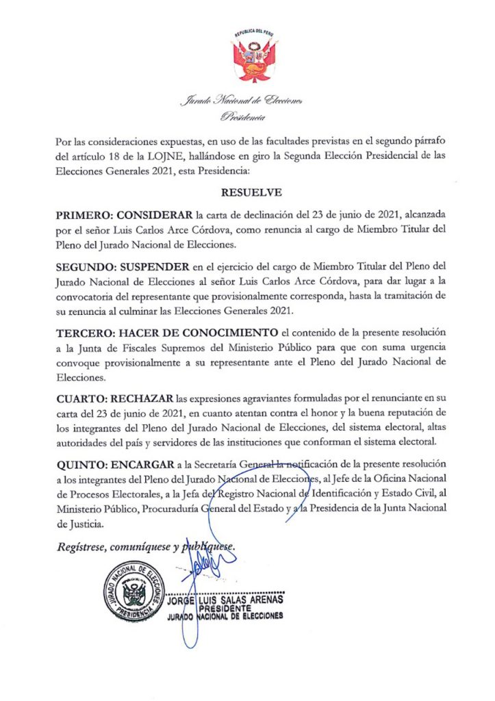 “Esta presidencia resuelve suspender en el ejercicio del cargo de Miembro Titular del Pleno del JNE al señor Luis Carlos Arce Córdova, para dar lugar a la convocatoria del representante que provisionalmente corresponda, hasta la tramitación de su renuncia al culminar las Elecciones Generales 2021″, se lee en el documento.