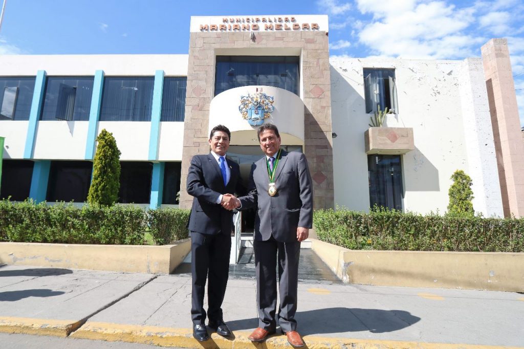 En su visita a la Municipalidad Distrital de Mariano Melgar, el representante de las comunas del Perú, fue recibido por el alcalde, Oscar Ayala Arenas, y el pleno del Concejo Municipal en medio de gran algarabía; compartiendo experiencias gubernamentales, realizando intercambios culturales y plasmando objetivos en común.