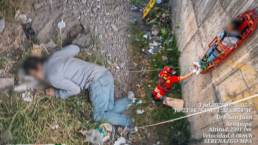 Agentes de serenazgo descendieron hasta la torrentera para brindar los primeros auxilios, en coordinación con miembros del Cuerpo General de Bomberos Voluntarios del Perú.