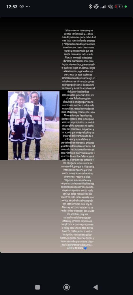“Pido disculpas por el penal fallado ayer, pido disculpas si en algún partido no rendí como muchos o todos esperaban. Nunca hice nada con mala intención ni con egoísmo. Alianza siempre fue mi casa y siempre lo será”, expresó Peña en su mensaje.