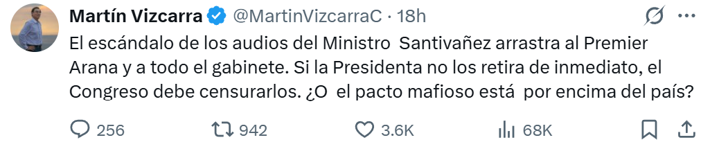 El expresidente Martín Vizcarra se pronunció a través de su cuenta de X tras la difusión de audios que vinculan al primer ministro, Eduardo Arana, y al ministro de Justicia y Derechos Humanos, Juan José Santiváñez. Según el programa dominical Panorama, ambos funcionarios habrían gestionado beneficios a favor de Miguel Marcelo Salirrosas, alias “El Diablo”.